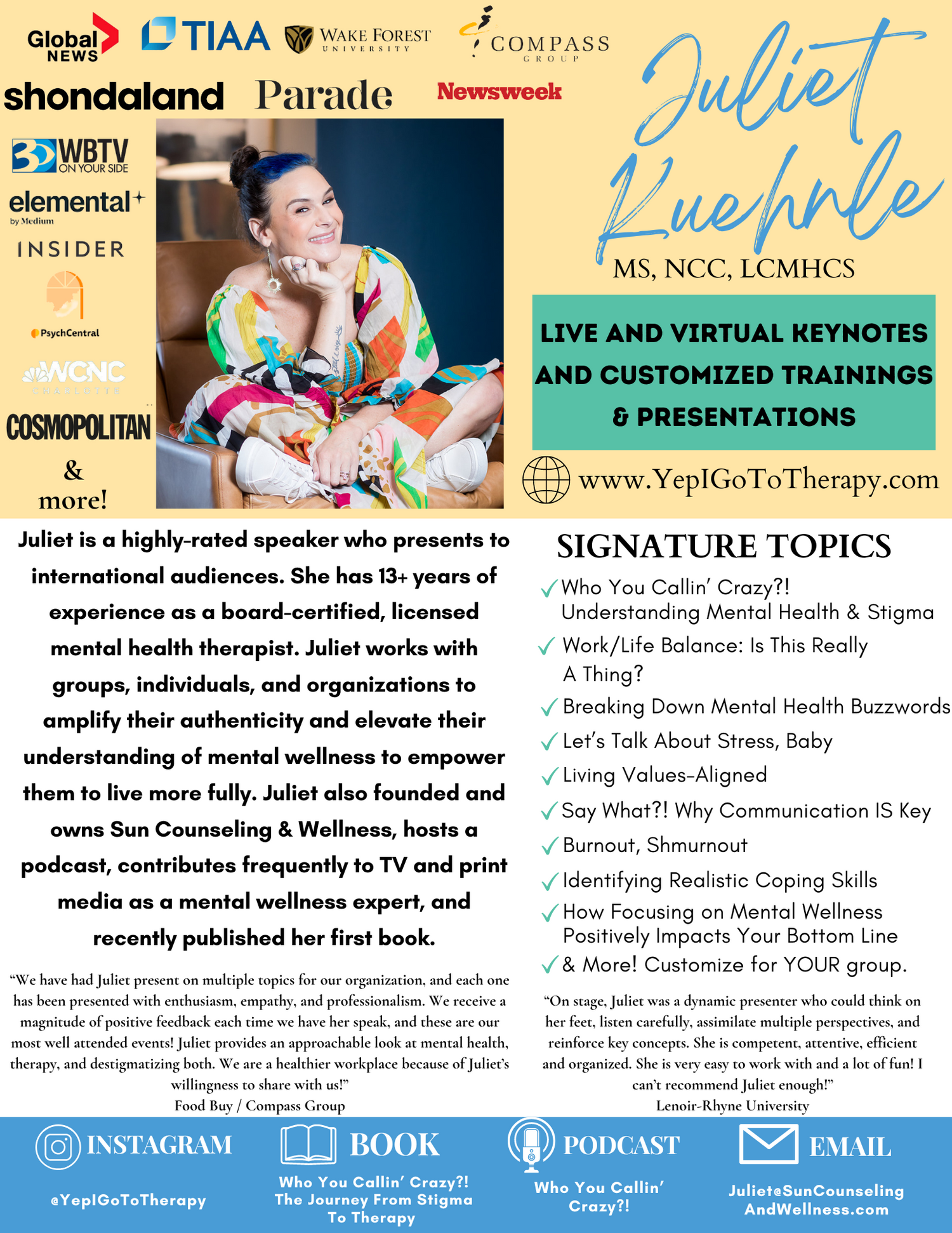 As a licensed therapist, author, and global mental health speaker, Juliet blends lived experience, clinical expertise, and humor to create unforgettable presentations that leave people feeling seen, inspired, and equipped with real tools for life and work.